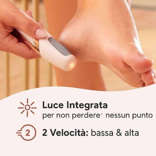 Funziona efficacemente su talloni, pianta e dita, sia su pelle secca che molto dura, offrendo risultati professionali direttamente a casa tua, senza stress né fatica.